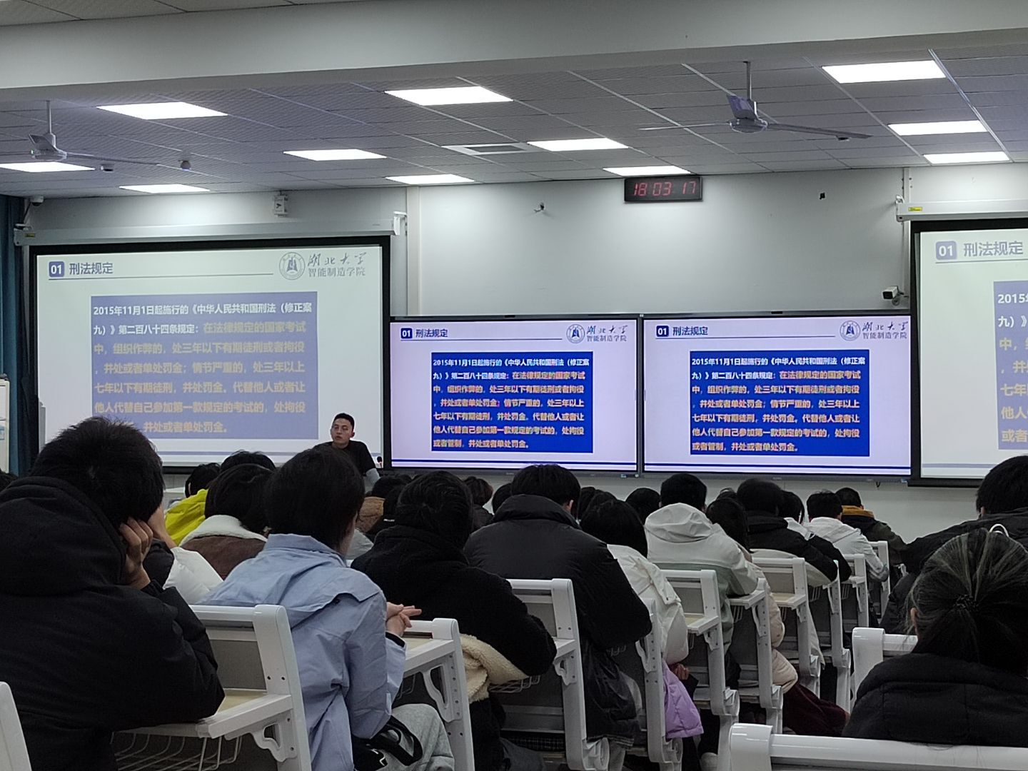 随后,黄永潮带领全体同学深入研读《国家教育考试违规处理办法》《湖北大学学生违纪处分办法(修订)》等法律法规和学校规章制度,通过PPT展示、案例剖析等方式,讲解并通报了近年来学校查处的多起典型考试违纪违规案例。通过复盘案例细节、解读处理结果,将抽象的考纪规定转化为具象化的警示教材,让同学们深刻认识到考试违纪作弊的严重后果。同时,黄永潮强调,学院对各类考试违纪作弊行为坚持“零容忍”态度,如在期末考试过程中发现参考学生有相关行为,学院将严格依据有关规定严肃处理,坚决筑牢同学们严守考纪的思想防线。